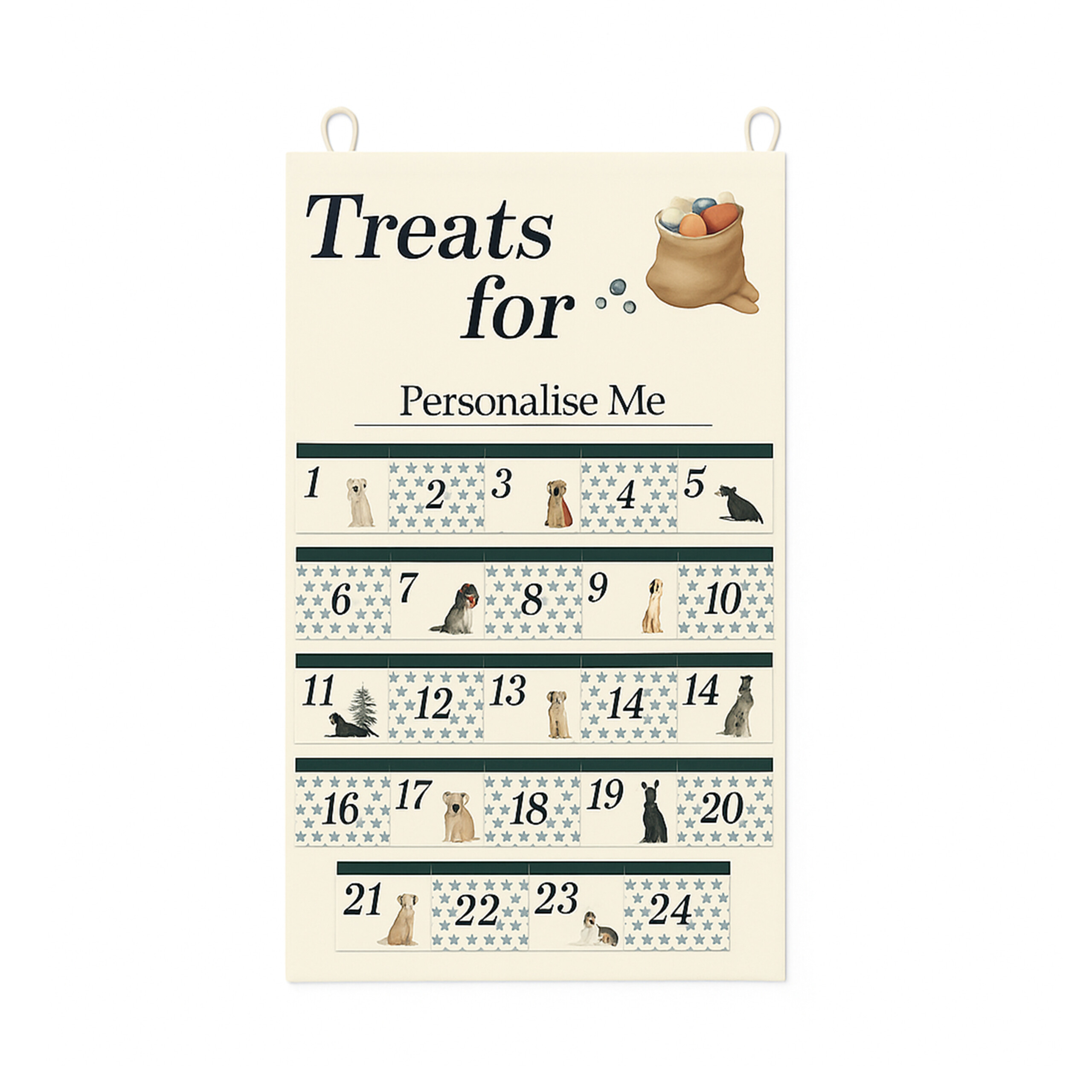 This adorable personalised dog treat advent calendar features 24 stitched pockets, each waiting to be filled with their favourite snacks. With playful dog illustrations and paw print fabric, it’s a charming and reusable way to celebrate your four-legged friend every December.