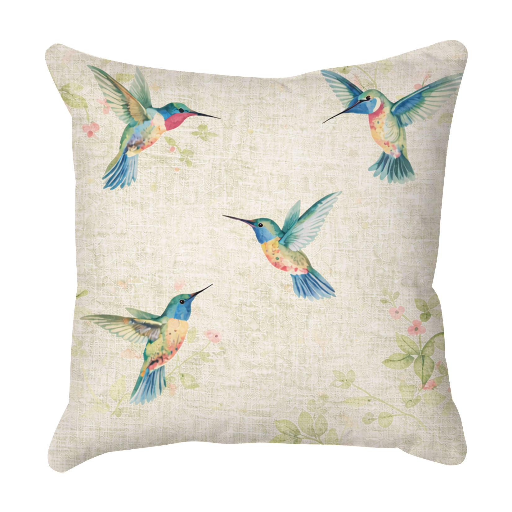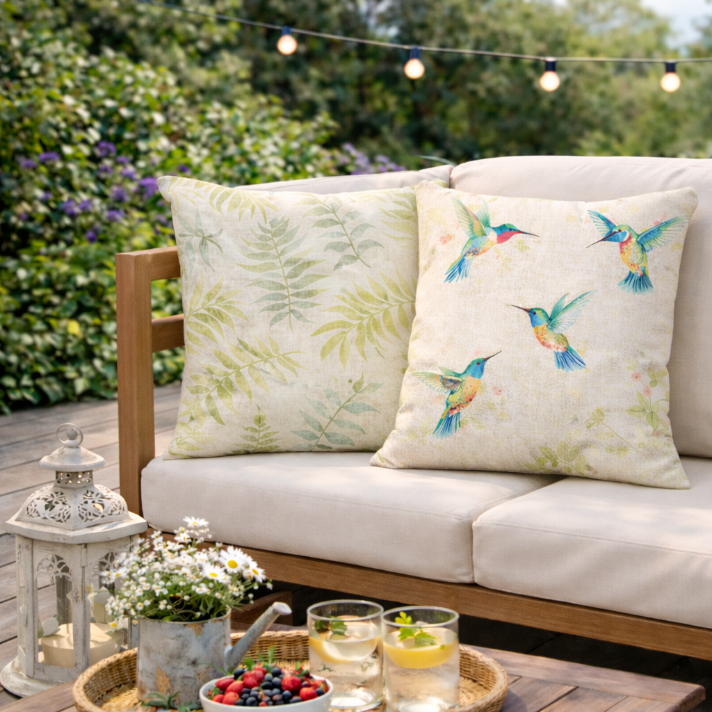 Graceful and full of colour, the Emerald Hummingbirds cushion brings an artistic and uplifting presence to any outdoor space. Set against a soft, textured neutral background with subtle leafy details, this cushion features a stunning display of watercolour-style hummingbirds in mid-flight—each one adorned in shades of emerald green, sapphire blue, blush pink, and golden yellow.