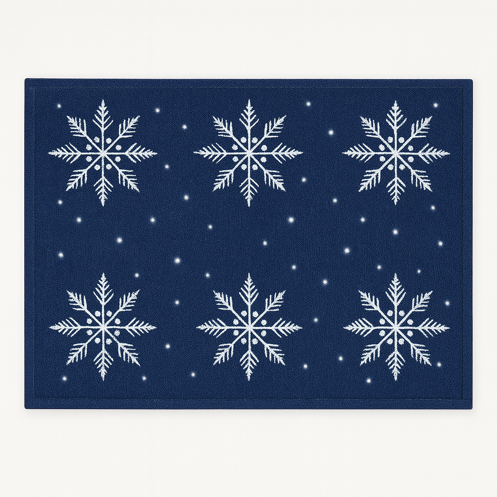 Rich navy fabric sets the stage for crisp white snowflakes, falling in an elegant scattered pattern. This design captures the stillness of a snowy winter night, bringing a modern yet timeless look to the table. A striking choice for holiday dinners, evoking both elegance and seasonal magic.