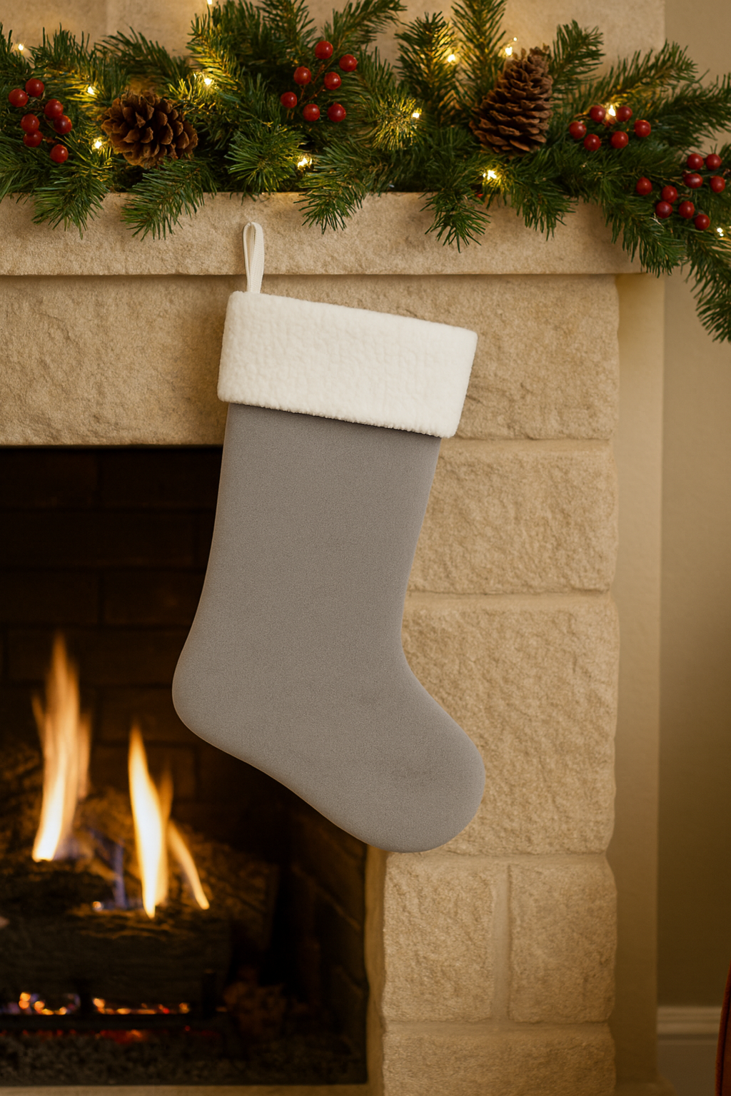 Understated and elegant, this modern grey Christmas stocking offers a chic alternative to traditional festive colours. The body is made from a smooth, soft-touch grey fabric that complements minimalist or contemporary holiday décor. The plush white fleece cuff adds a cosy finish, making it a versatile addition to any festive setup.