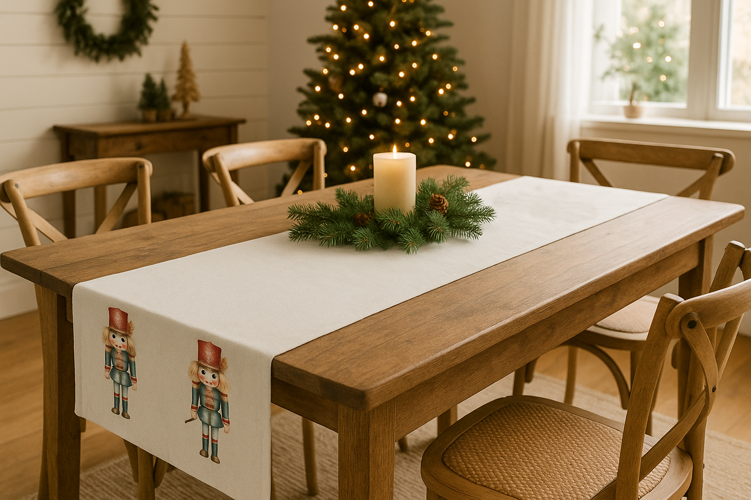 A festive celebration of tradition, this runner is adorned with whimsical nutcracker figures in muted teal and red hues, holding lanterns of gold. Placed at each end, the nutcrackers add character without overwhelming the centre, making it perfect for showcasing festive tableware and centrepieces. A nostalgic nod to Christmas classics.
