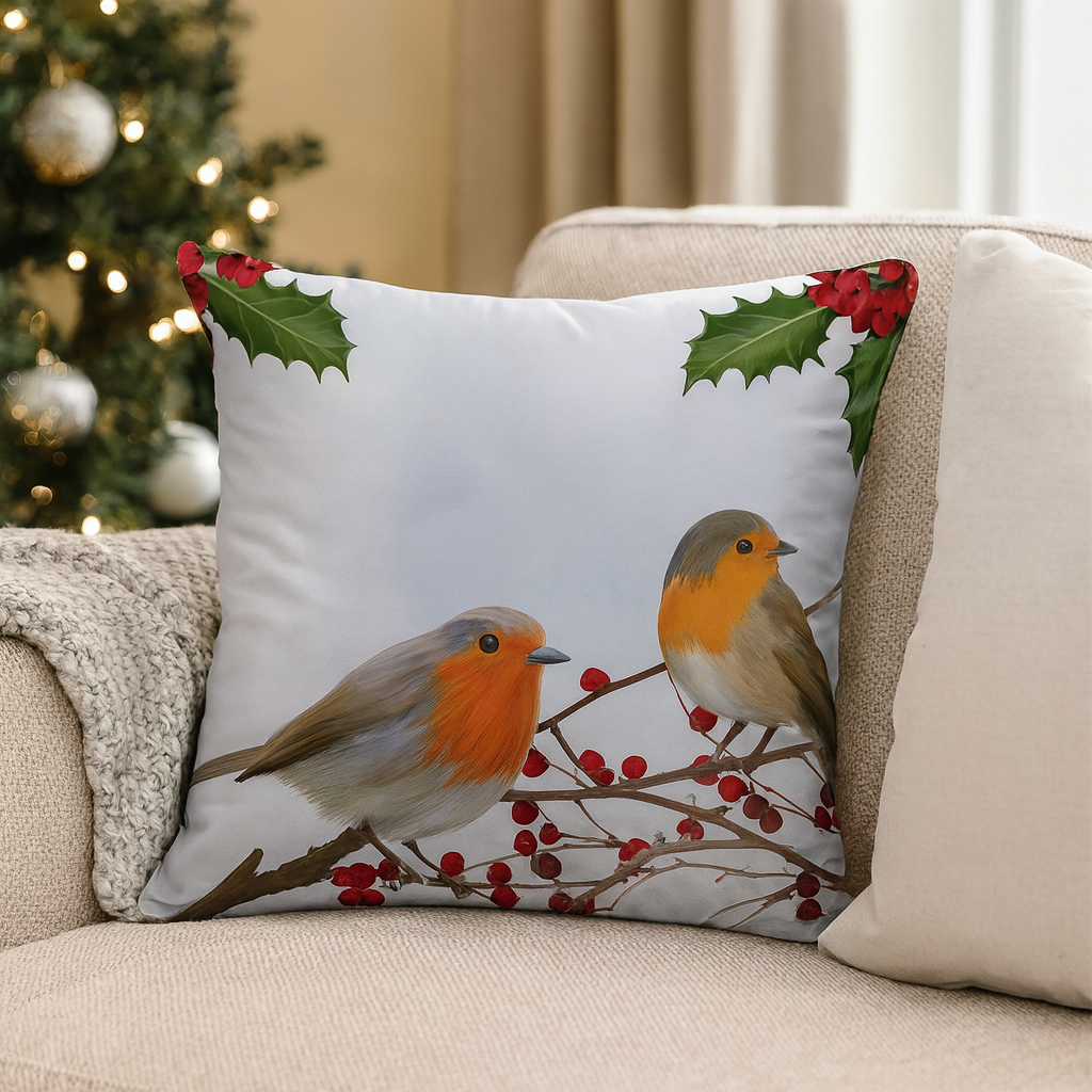 Celebrate togetherness with Robin Pair. Two hand-painted robins perch among bright red berries and holly leaves, symbolising love and companionship during the festive season. A gentle, heartfelt design that makes a thoughtful Christmas gift.