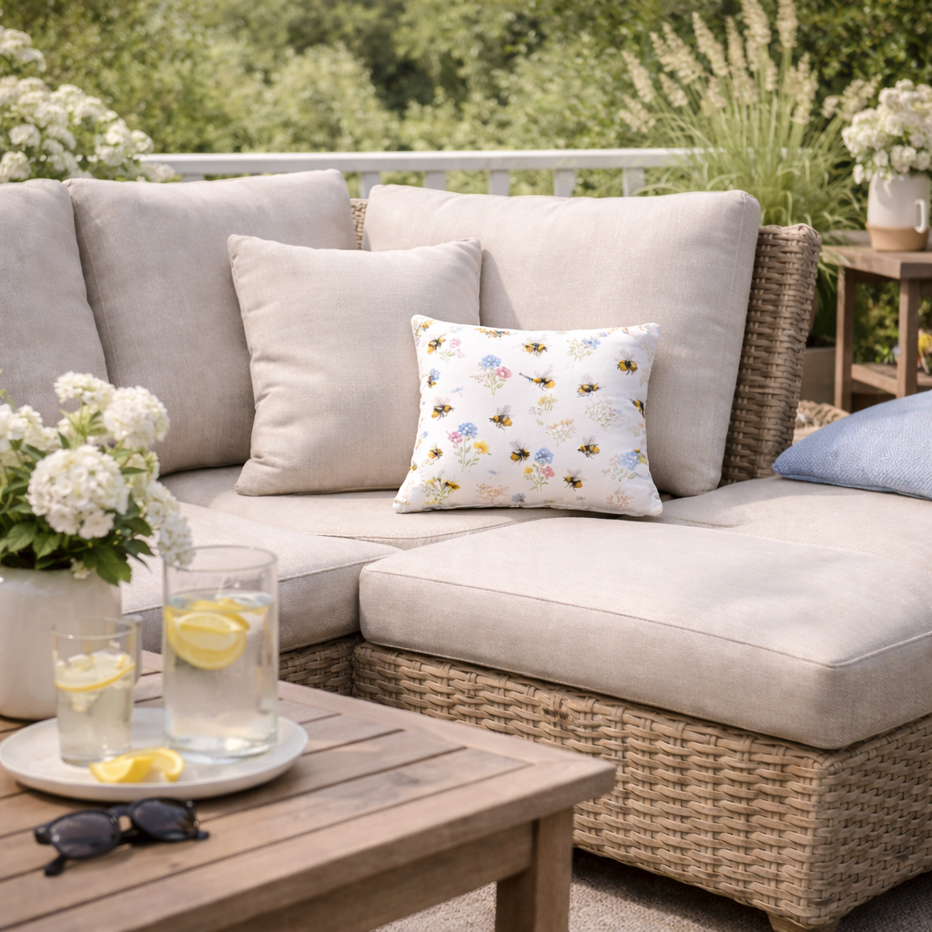 Bursting with colour, life, and countryside charm, the Wildflower & Bee Meadow cushion is a celebration of nature in full bloom. Featuring a delightful scatter of hand-painted wildflowers in pastel shades—think buttercup yellow, sky blue, blush pink, and soft white—interwoven with playful bumblebees and fluttering dragonflies, this design captures the joyful energy of a wildflower meadow in summer.